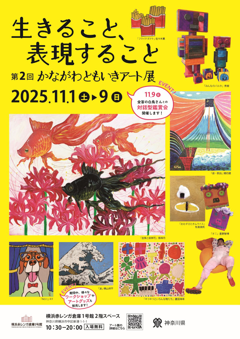 県では、「ともに生きる社会かながわ憲章」の理念のもと、障がい者アートを「ともいきアート」と称し、多くの方に作品の魅力を知っていただくため、昨年度に引き続き、「第2回かながわともいきアート展~生きること、表現すること~」を開催します。200点以上の作品を展示するほか、さまざまな来場者が安心して楽しめるよう、通常の展覧会とはひと味ちがったイベ ントやワークショップも実施しますので、是非お越しください!
